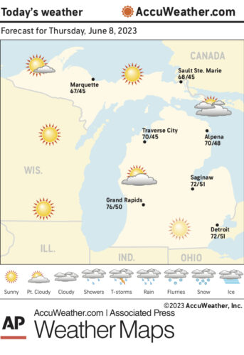 Marquette and vicinity: Today, sunny, with a high near 72. West wind 5 to 10 mph becoming north in the afternoon.