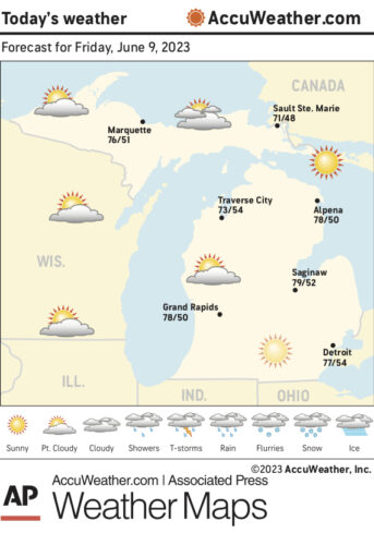 Marquette and vicinity: Today, sunny, with a high near 68. North wind 5 to 10 mph. Tonight, mostly clear, with a low around 42. North wind around 5 mph becoming west after midnight.