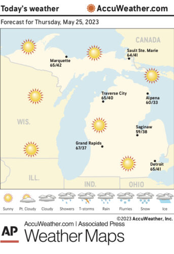 Marquette and vicinity: Today, sunny, with a high near 76. South wind around 5 mph. Tonight, clear, with a low around 46. South wind 5 to 10 mph becoming southwest after midnight.
