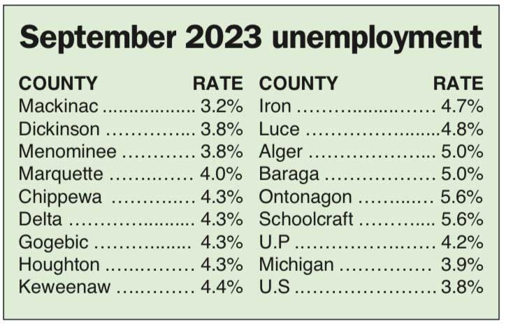 RON MOUNTAIN — The Upper Peninsula jobless rate dropped to 4.2% in September, down from 4.8% in August, with part of the decline due to fewer people in the labor force.