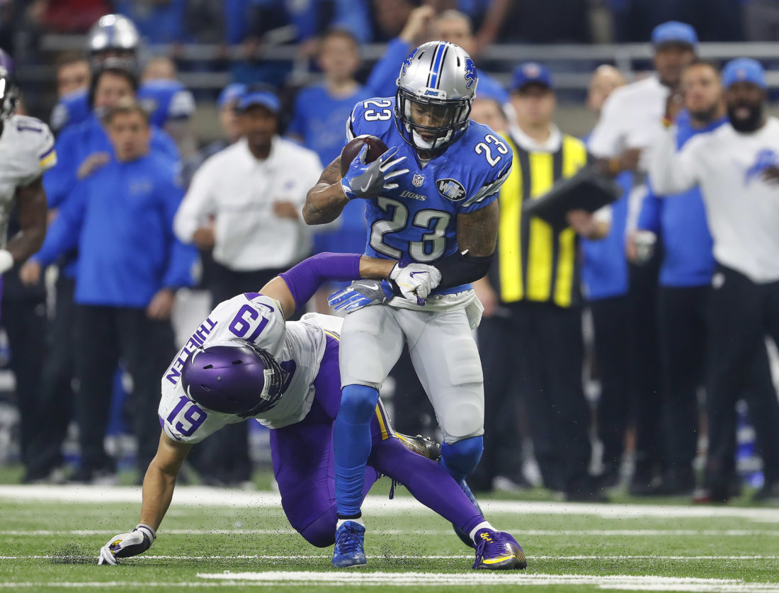 Detroit Lions cornerback Darius Slay (23) intercepts a pass intended for Minnesota Vikings wide receiver Adam Thielen (19) in the fourth quarter of an NFL football game in Detroit, Thursday, Nov. 24, 2016. (AP Photo/Paul Sancya)