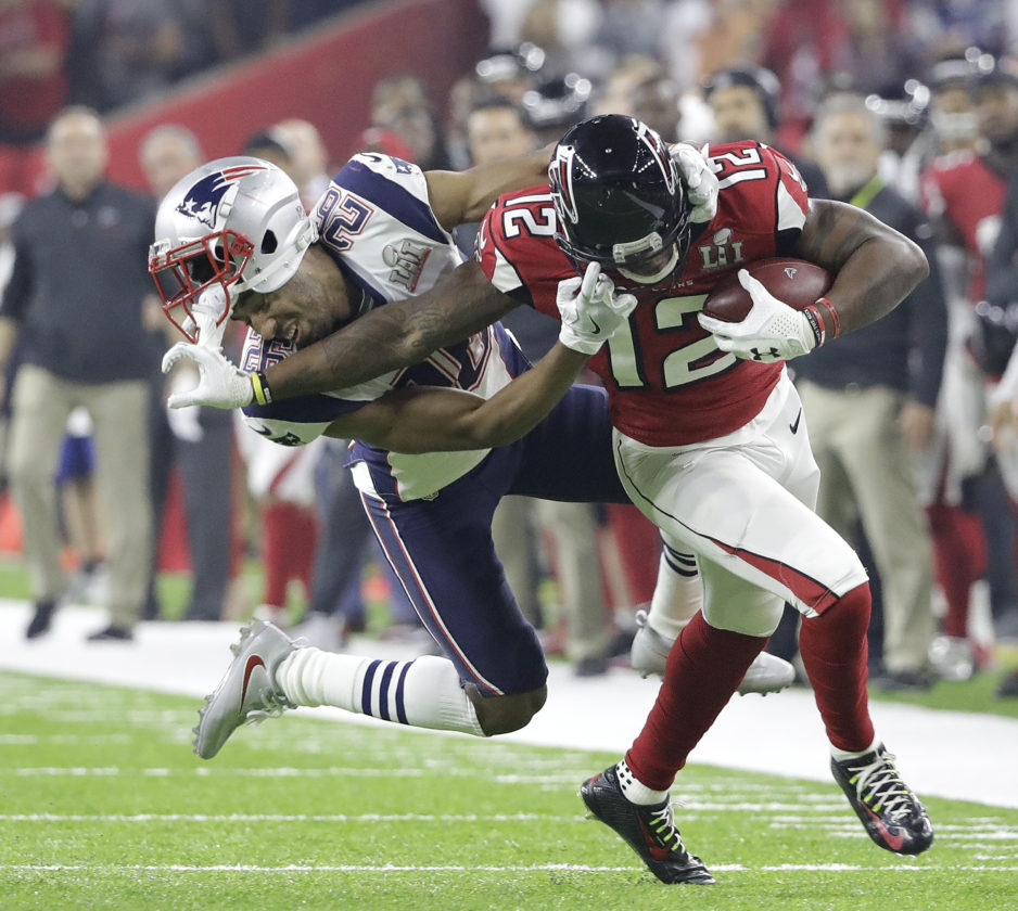 Atlanta Falcons' Mohamed Sanu, right, runs around New England Patriots' Logan Ryan during the second half of the NFL Super Bowl 51 football game Sunday, Feb. 5, 2017, in Houston. (AP Photo/Tony Gutierrez)