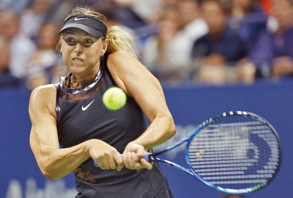 Maria Sharapova of Russia hits a return to No. 2 seed Simona Halep during the opening round of the U.S. Open in New York on Monday. (AP photo)