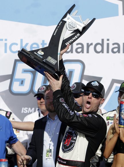 Kevin Harvick holds up the trophy after winning a NASCAR Cup Series auto race on Sunday, March 11, 2018, in Avondale, Ariz. (AP Photo/Rick Scuteri)