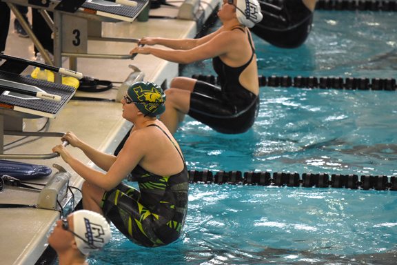 Northern Michigan University sophomore Rachel Helm readies for the start of a women's backstroke event at the GLIAC Championships held in the Grand Rapids suburb of Jenison on Feb. 17. She set a conference meet-record of 1:56.38 in the 200 back for her fourth win at the meet and was subsequently named GLIAC Women's Swimmer of the Year. (Photo courtesy NMU)