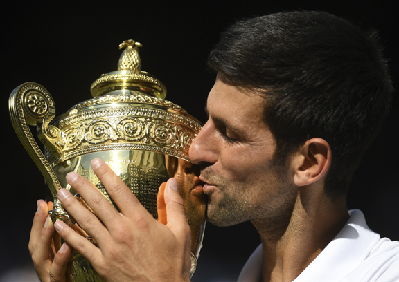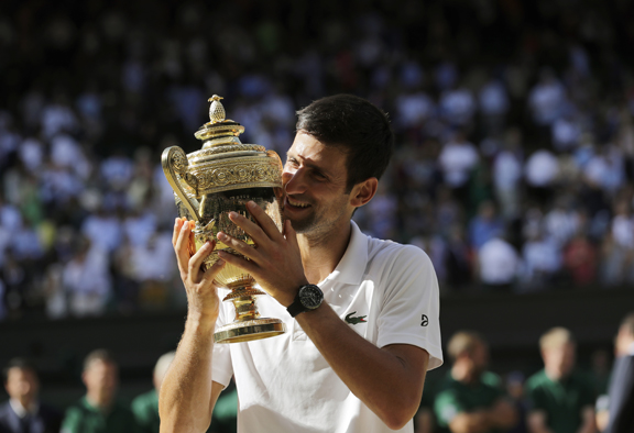 - Novak Djokovic of Serbia holds the trophy after defeating Kevin Anderson of South Africa in the men’s singles final match at the Wimbledon Tennis Championships in London on Sunday. (AP photo)