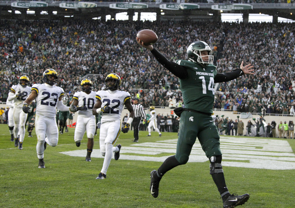 Michigan State quarterback Brian Lewerke, right, celebrates after making a touchdown reception against Michigan in their game played in East Lansing on Oct. 20. (AP photo)