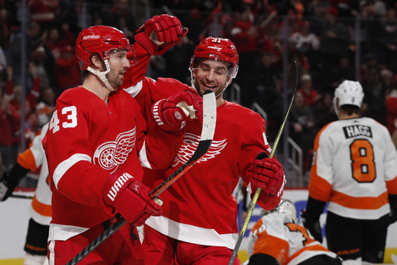 Red Wings left wing Darren Helm, left, is congratulated on his goal by teammate Frans Nielsen during the second period against the Philadelphia Flyers on Sunday in Detroit. (AP photo)
