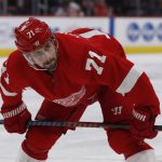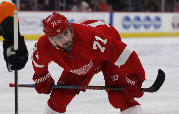 Red Wings center Dylan Larkin waits on a faceoff during the second period against the Philadelphia Flyers on Sunday in Detroit. (AP photo)
