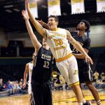 - Northern Michigan University’s Isaiah Johnson floats up a shot against a pair of Purdue Northwest defenders during their GLIAC basketball game played at the Berry Events Center in Marquette on Dec. 6. (Photo courtesy Daryl T. Jarvinen)