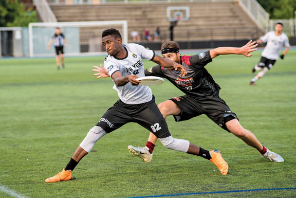 New York Empire’s Marques Brownlee throws a frisbee in front of a Toronto Rush player on July 28 in an American Ultimate Disc League game in Toronto. (AP photo)