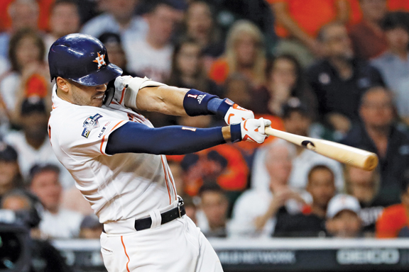 The Astros’ Carlos Correa hits a walk-off home run against the New York Yankees during the 11th inning in Game 2 of the American League Championship Series on Sunday in Houston. (AP photo)