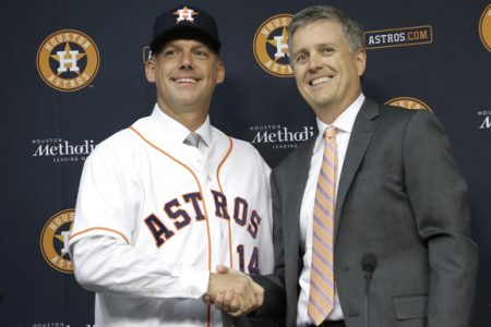 - In this Sept. 29, 2014, file photo, Houston Astros general manager Jeff Luhnow, right, and A.J. Hinch pose after Hinch is introduced as the new manager of the club. (AP file photo)