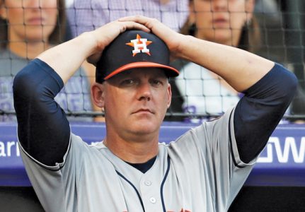 - Houston Astros manager AJ Hinch reacts during a July 2 game against the Colorado Rockies played in Denver. Houston manager AJ Hinch and general manager Jeff Luhnow were suspended for the entire season Monday, and the team was fined $5 million for sign-stealing by the team in the 2017 and 2018 seasons. Later in the day, the pair were fired by the team. Commissioner Rob Manfred announced the discipline and strongly hinted that current Boston manager Alex Cora — the Astros bench coach in 2017 — will face punishment later. Manfred said Cora developed the sign-stealing system used by the Astros. (AP file photo)
