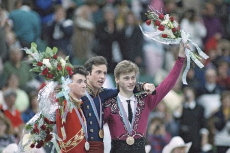 - U.S. figure skater Brian Boitano, center, who won the gold medal, is flanked by silver medalist Brian Orser, left, of Canada, and bronze medalist Alexandre Fadeev, right, of the Soviet Union, at the medal ceremony following the men’s figure skating competition at the Winter Olympics in Calgary, Canada, on Feb. 20, 1988. (AP file photo)