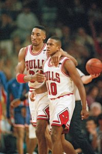 - The Chicago Bulls’ Scottie Pippen, left, and B.J. Armstrong walk up court during a break in the action of a playoff game against the New York Knicks in May 1994. (AP file photo)