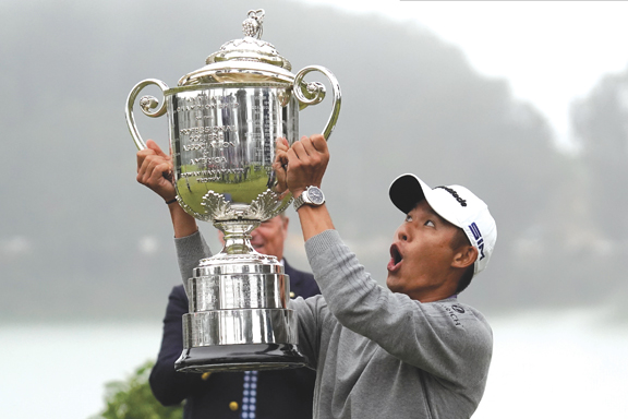 Collin Morikawa reacts as the top of the Wanamaker Trophy falls after winning the PGA Championship at TPC Harding Park on Sunday in San Francisco. (AP photo)
