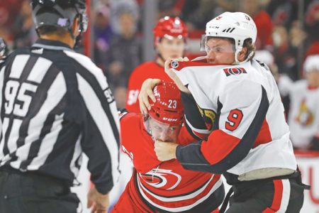 - The Ottawa Senators’ Bobby Ryan, right, and Carolina Hurricanes’ Brock McGinn exchange blows during the first period in Raleigh, N.C., on Nov. 11. (AP file photo)