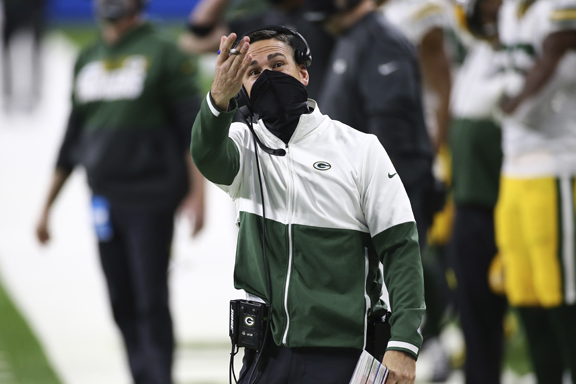 - Green Bay Packers head coach Matt LaFleur points to the scoreboard during the first half against the Lions on Dec. 13 in Detroit. (AP file photo)