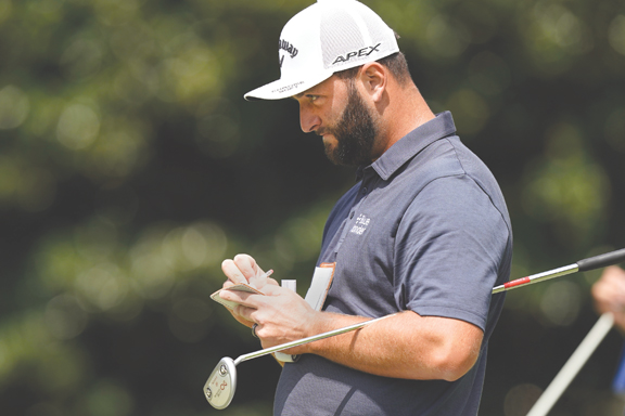- Jon Rahm writes in a notebook as he prepares to putt during the second round in the Tour Championship at East Lake Golf Club on Friday in Atlanta. (AP photo)