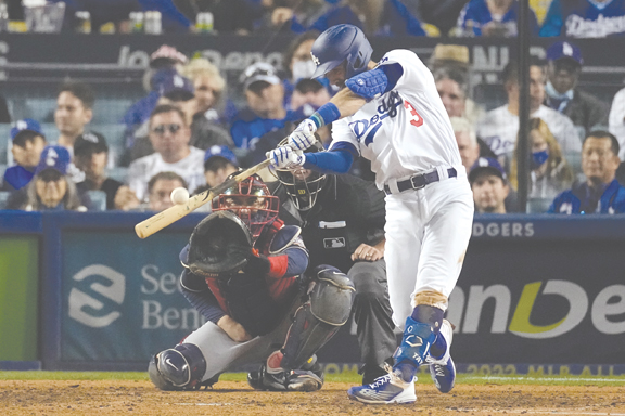 The Dodgers’ Chris Taylor hits a solo home run in the seventh inning against the Atlanta Braves in Game 5 of the National League Championship Series on Thursday in Los Angeles. (AP photo)
