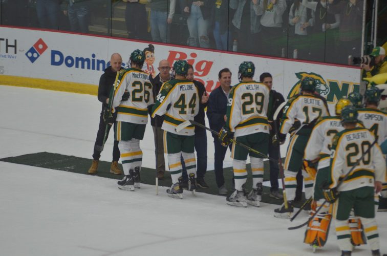 Vanderbeck made it 3-1 in the final minute before the intermission honoring the ’91 team, with assists going to Crone and Ben Newhouse. Vanderbeck found his own rebound at the top of the slot and fired it back through traffic.