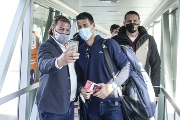 A man takes a selfie photograph with Serbian tennis player Novak Djokovic after his arrival in Belgrade, Serbia, on Monday. Djokovic arrived in the Serbian capital following his deportation from Australia on Sunday after losing a bid to stay in the country to defend his Australian Open title despite not being vaccinated against COVID-19. (AP photo)
