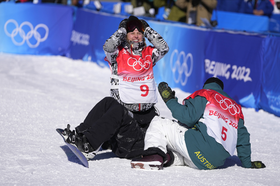 - American Julia Marino, left, New Zealand’s Zoi Sadowski Synnott, partially hidden, and Australia’s Tess Coady, right, celebrate after competing in the women’s slopestyle finals at the 2022 Winter Olympics on Sunday in Zhangjiakou, China. (AP photo)