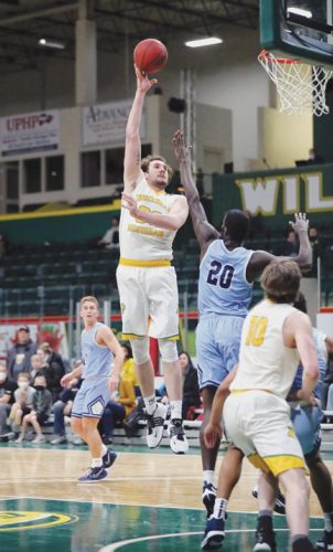 Northern Michigan University’s Ben Wolf, left, sinks this short jumper as he elevates over the defense of Northwood’s Jean Pierre Frederick in the first half at the Berry Events Center in Marquette on Jan. 29. (Photo courtesy Daryl T. Jarvinen)