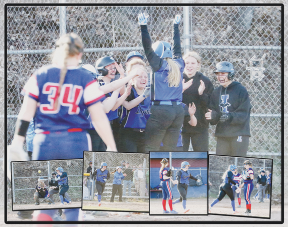 This photo collage shows Ishpeming's Abby Koski hitting and scoring a home run — actually a grand slam — in the sixth inning of the second game of a high school softball doubleheader against Westwood in National Mine on Thursday. The main photo shows Koski leaping on home plate with teammates congratulating her. In the inset photos, from left, Koski connects on a pitch from the Patriots' Taylor Jackovich with Westwood's Emersyn Nelson catching and Charlie Morrison as umpire; Koski rounds first base with base coach Beth Graham and Koski's parents Byron and Wendy cheering her; Koski rounds second base with a congratulatory slap from Pats' second baseman Elise Ketola; and Koski rounds third base with congratulations from Westwood shortstop Natalie Prophet. (Photo illustration by Daryl T. Jarvinen)