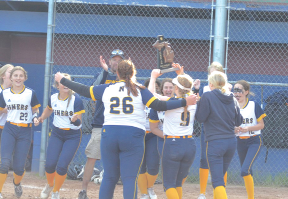 Neagunee's Josie Thomson, center facing away, holds the championship trophy as her Miners' teammates mob her and head coach Randy Carlson, back left, claps after Negaunee defeated Calumet in the MHSAA Division 3 softball district tournament title game played at National Mine on Friday. (Journal photo by Travis Nelson)