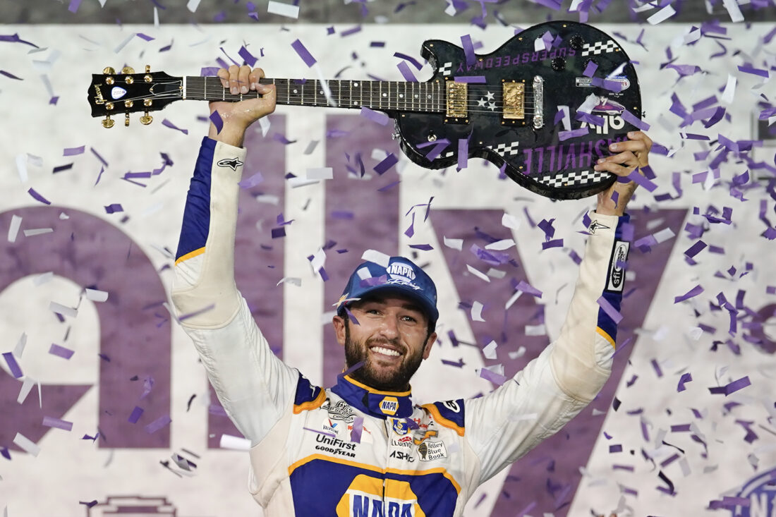 Chase Elliott holds the guitar presented to him after winning a NASCAR Cup Series auto race Sunday, June 26, 2022, in Lebanon, Tenn. (AP Photo/Mark Humphrey)