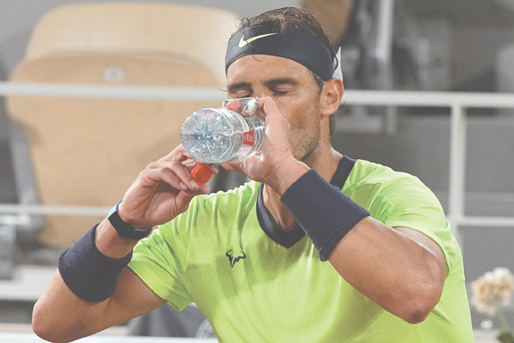 - Rafael Nadal takes a drink at a change of ends as he plays against Richard Gasquet of France during their second round match at the French Open at Roland Garros in Paris on June 3, 2021. (AP file photo)