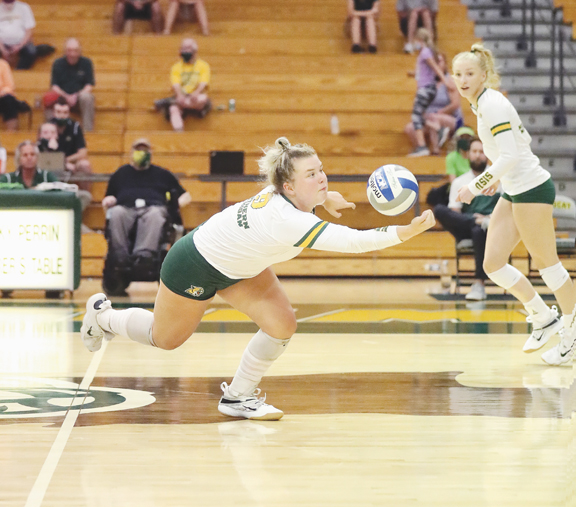 Northern Michigan University’s Lauren Van Remortel, left, lunges for a set as teammate Ania Hyatt looks on in a match against Saginaw Valley State on Oct. 1 at Vandament Arena in Marquette. (Photo courtesy Daryl T. Jarvinen)