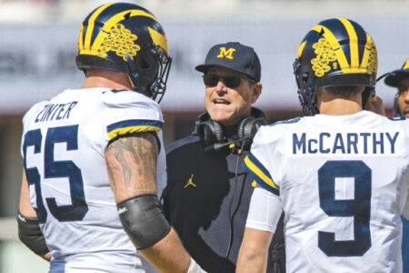 - Michigan head coach Jim Harbaugh talks with offensive lineman Zak Zinter, left, and quarterback J.J. McCarthy on Saturday in Bloomington, Ind. (AP photo)