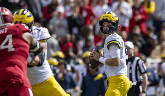 - Michigan quarterback J.J. McCarthy, right, drops back to pass in a game against Indiana on Saturday in Bloomington, Ind. (AP photo)