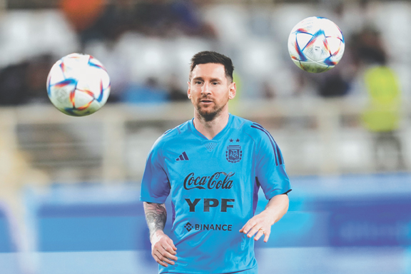 - Argentina’s Lionel Messi warms up Monday during a training session ahead of the country’s friendly match today with the United Arab Emirates in Abu Dhabi, United Arab Emirates. (AP photo)