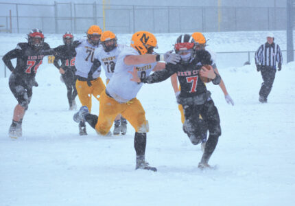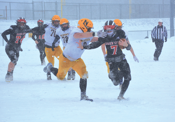 Negaunee linebacker Eli VanBuren, front left, reaches out to grab Reed City running back John Ondrus during the fourth quarter of an MHSAA 11-player football Division 6 semifinal playoff game in Gaylord on Nov. 19. (Cadillac News photo by Ricardo Martin)