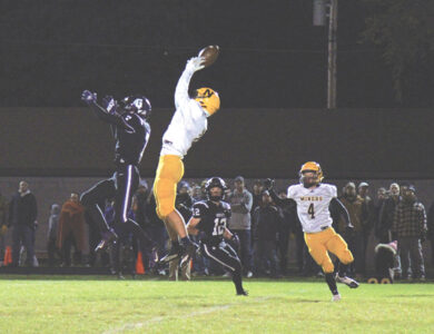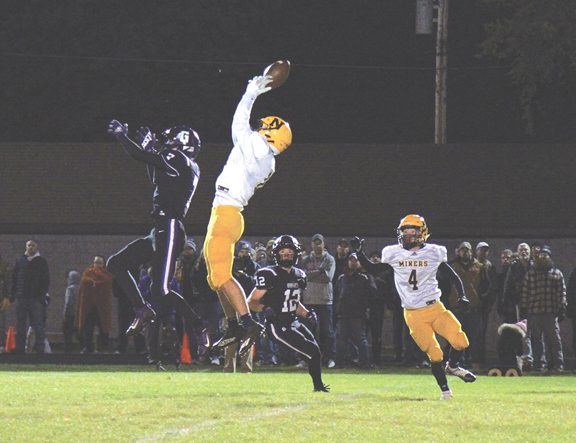 - Negaunee defensive back Philip Nelson, center right, leaps high just behind a Gladstone receiver to get his fingertips on the ball attempting to make an interception during their high school football game played in Gladstone on Oct. 7. While Nelson didn’t make the pickoff, Miners’ teammate James Thomson, No. 4 at right, did to give Negaunee possession of the ball. (Escanaba Daily Press photo by Ilsa Minor)