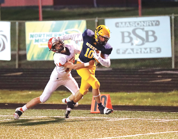 - Negaunee’s Philip Nelson, right, stiff arms Westwood defender Talan Peterson after Nelson caught a pass from Ty Jacobson in the third quarter of their high school football game played at William R. Hart Stadium in Marquette on Oct. 20. The game was moved to Marquette due to heavy snow that fell in the Negaunee area earlier in the week. (Photo courtesy Daryl T. Jarvinen)