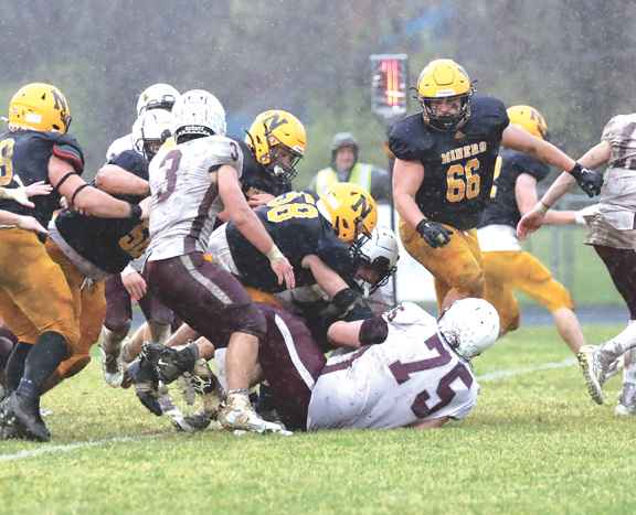 Negaunee's Nico Lukkarinen, top center, forces his way into the end zone as he follows the block of teammate Drake Spickerman, No. 58 at center, in an MHSAA Division 6 playoff game played at Miners Field in Negaunee on Nov. 5. Spickerman knocked Menominee's Lucas Thoune, No. 75 at bottom, to the ground at the goal line to allow Lukkarinen to score in the third quarter. (Photo courtesy Daryl T. Jarvinen)