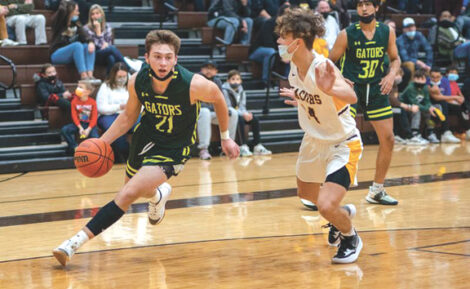 Cooper LePage, left, of Crystal Lake South, Ill., dribbles in a December 2021 game in Algonquin, Ill. (Shaw Local photo by Sean King)