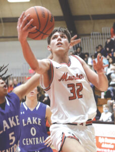 Brandon Trilli goes for a layup during a January game for Munster, Ind. (Photo courtesy Post-Tribune of Northwest Indiana)
