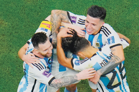 - Argentina players celebrate with Argentina’s Lionel Messi, left, who scored his side’s first goal with a penalty shot during the World Cup semifinal soccer match against Croatia at the Lusail Stadium in Lusail, Qatar, on Tuesday. (AP photo)