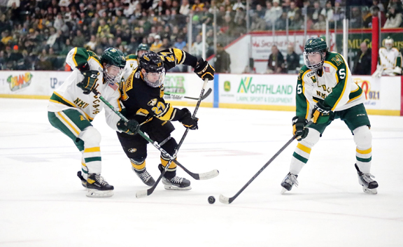 NMU had the initial scoring chances, including a one-timer by Joey Larson that went just wide, an open-net look by Artem Shlaine that rang off the post and a slick move by David Keefer to slide a backhand pass to Jett Jungels in the slot that went through the latter’s skates, according to a game account from NMU Sports Information.