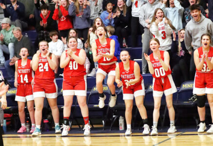 - The Westwood bench and Patriots’ fans behind them erupt in cheers after a late fourth-quarter basket of an MHSAA Division 3 district tournament girls basketball game played against Negaunee at Lakeview Memorial Gymnasium in Negaunee on Monday. (Photo courtesy Daryl T. Jarvinen)