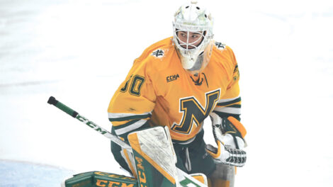 In Saturday’s game, he made 10 saves in the opening period when his teammates scored three goals. Then he weathered the storm the Huskies rained upon him in their home MacInnes Student Ice Arena as they tried to play catchup, peppering him with 19 shots in the second period and 15 more in the third before Northern’s late empty-net goal finished out the scoring.