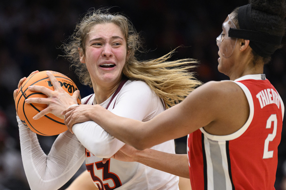 Virginia Tech center Elizabeth Kitley, left, fights off Ohio State forward Taylor Thierry as she attempts to strip the ball in the fourth quarter of an Elite 8 game of the NCAA Tournament on Monday in Seattle. (AP photo)