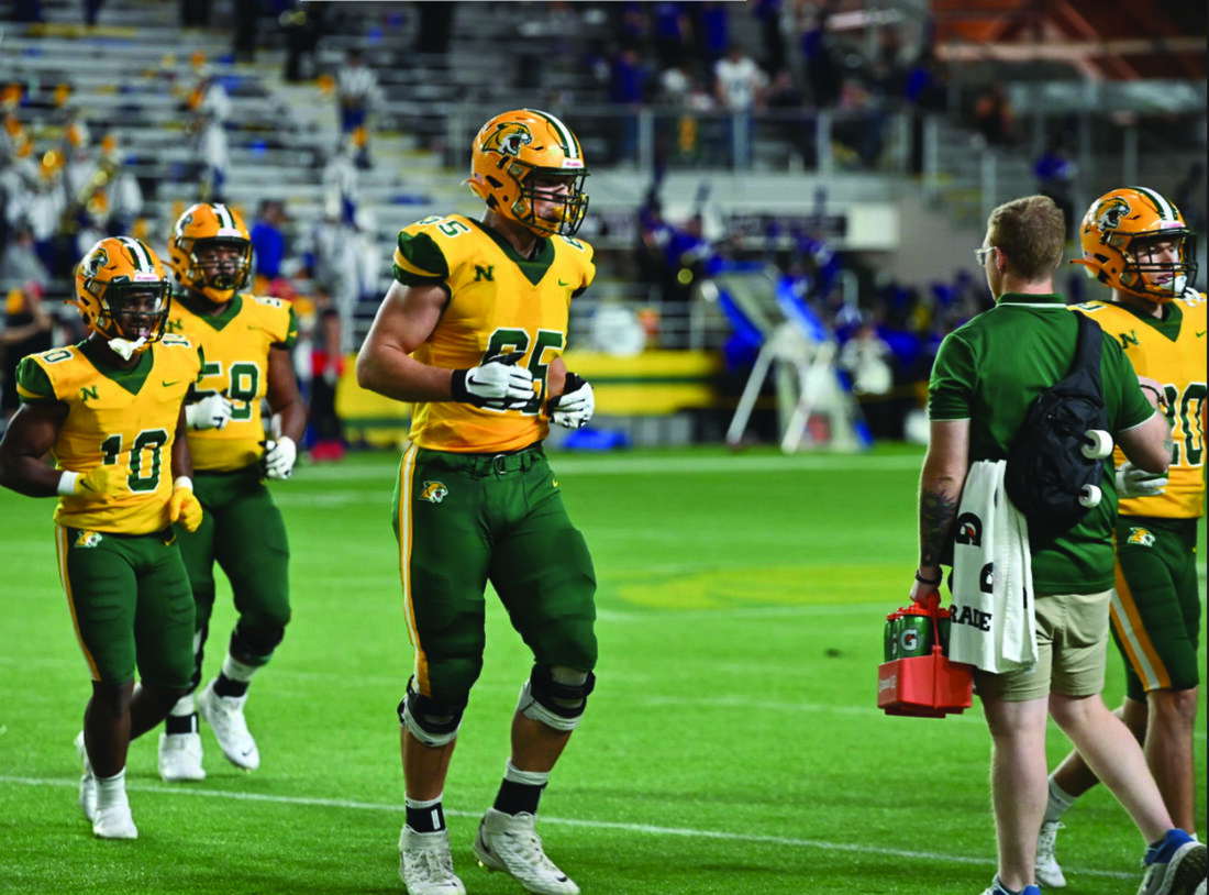 - Northern Michigan University’s Jake Witt, center, jogs off the field during a Wildcats’ game played in the Superior Dome in Marquette. (Photo courtesy Cara Kamps)