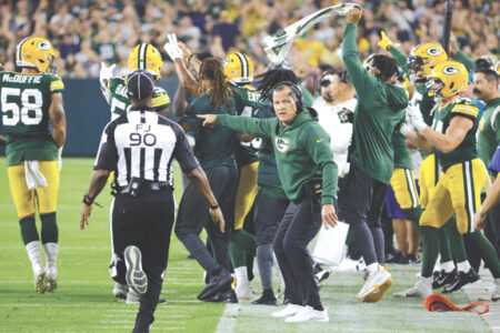 - Packers defensive coordinator Joe Barry, center, points at a play to an official during an NFL preseason game played Aug. 19 in Green Bay, Wis. (AP file photo)